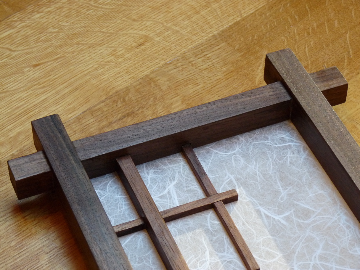 In an earlier posting, I had show what happens when the wrong length brad is in the nail gun. After removing the errant brads, I applied some shop sawn veneers to the wounded areas, refinished, and glued and stretched a new paper. There is a little color difference from the older wood getting some sun prior to repairing, but that will blend over time.
