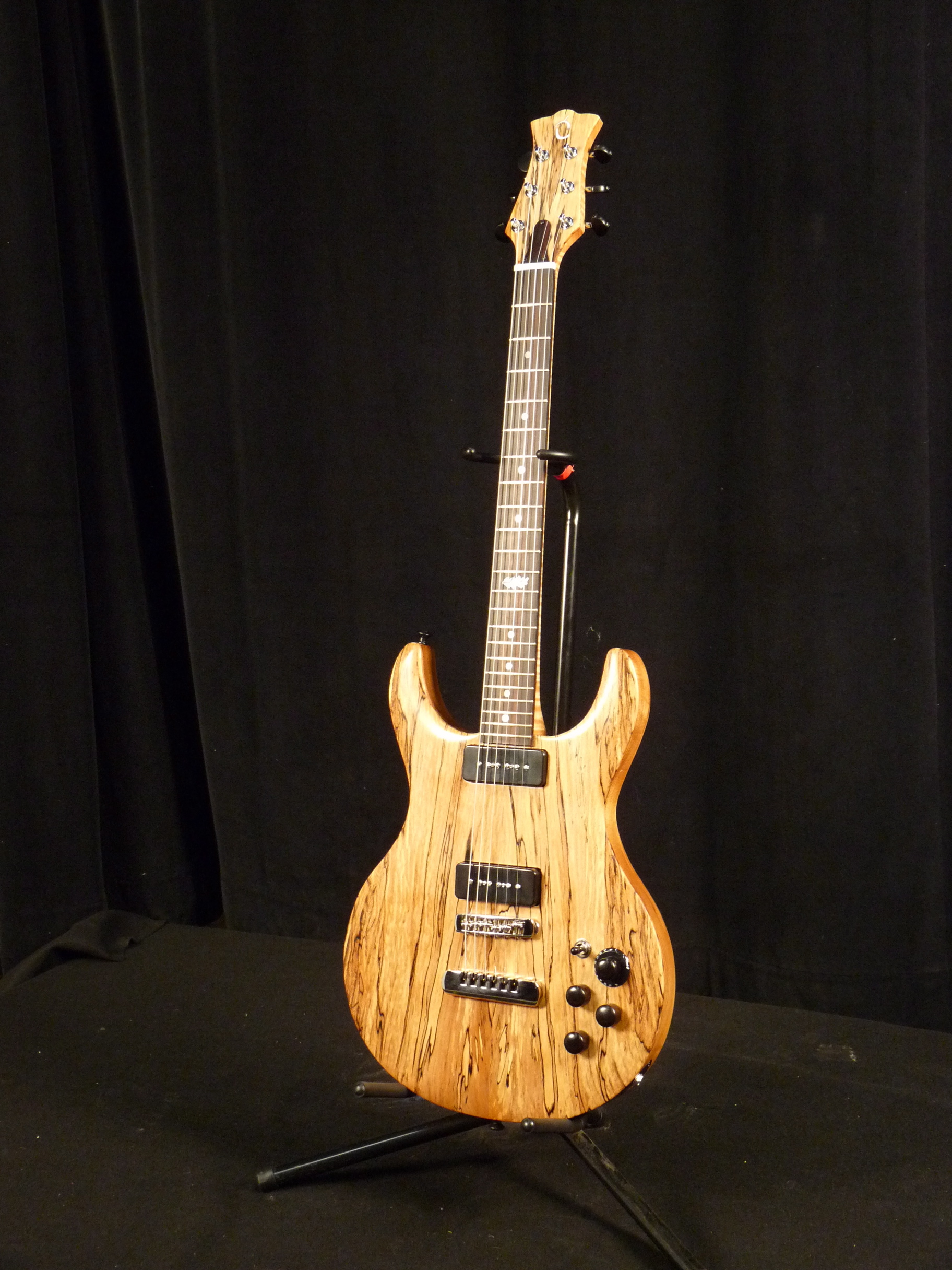Plugging it into an amp, turning it on, and…HEY, only one pickup is sounding! But, after checking the connections, playing with the knobs, it came to life. It must have been a stray bit of solder that worked itself loose; no problems since. A nice sound, although a little soft. But, after adjusting the pickup height, a nice full, rich sound. (I will be posting a video in the near future, so you can hear for yourselves.) All ready for its own page.