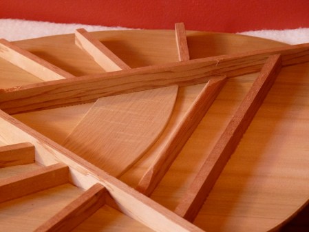 Then the lower tonebars, followed by the finger braces. Notice that the soundhole is also reinforced with spare soundboard cutoffs.