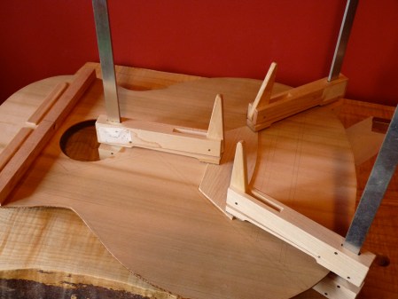 Once that is done, the braces can be added to the underside. For this plan, only the x-bracing is arced, every other piece has a flat bottom. First the upper transverse braceing and the maple bridge plate. (You can see how important it is to have the soundhole cut out first. It is a handy clamp location!)