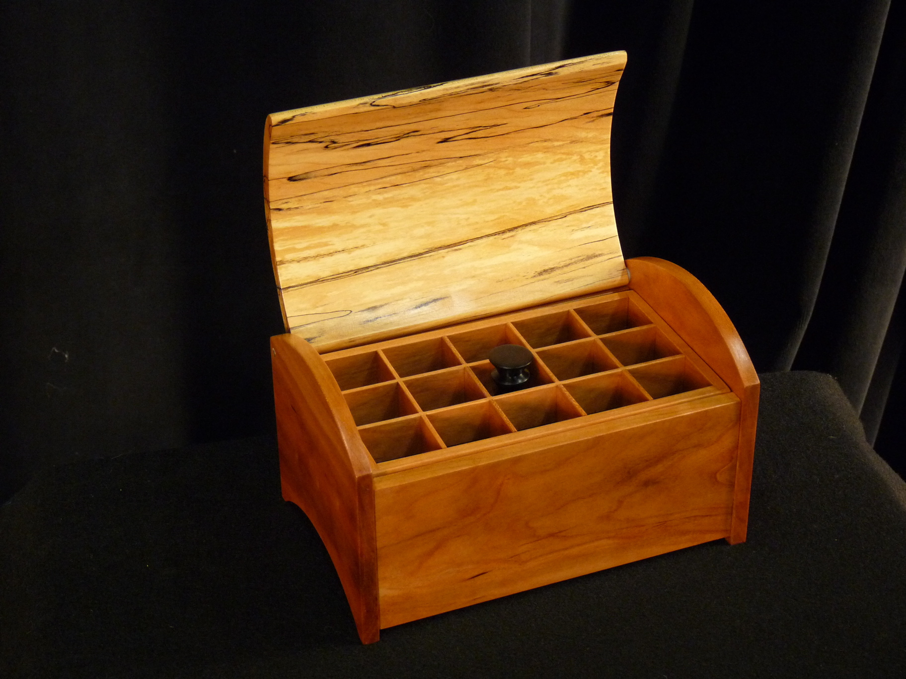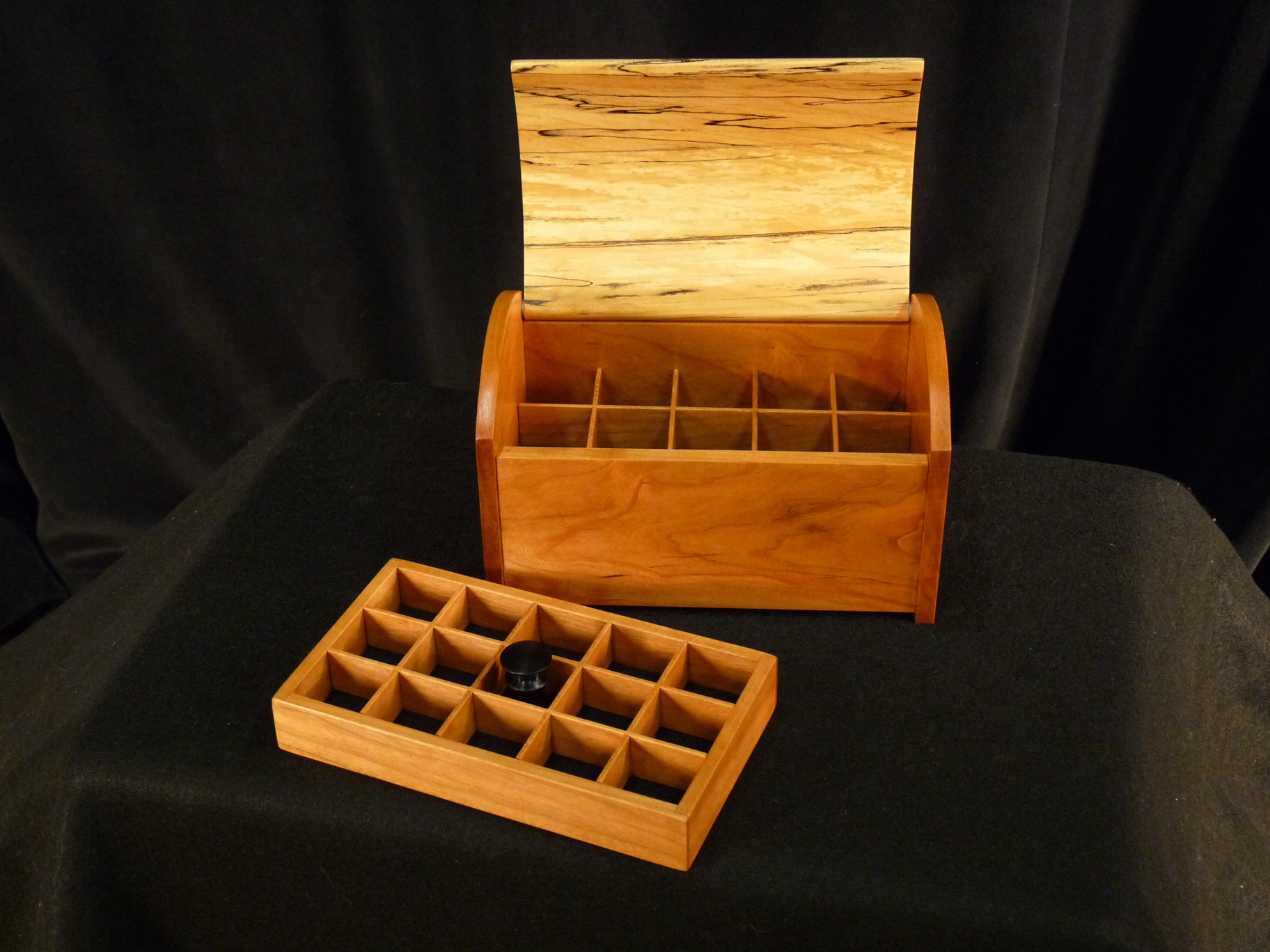 Spalted maple, cherry and African Blackwood with 29 compartments for earrings.