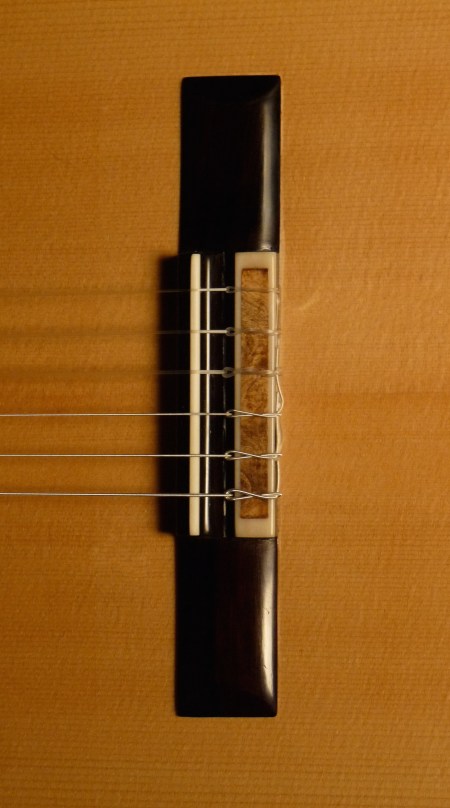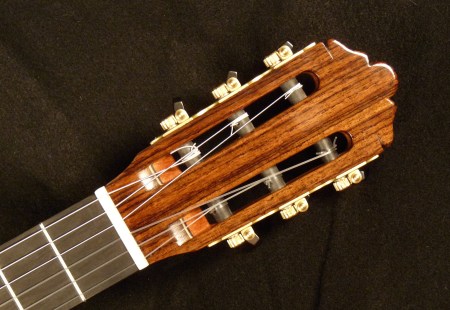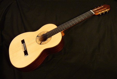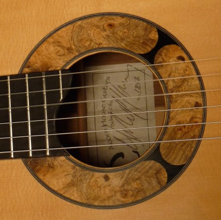 East Indian Rosewood back and sides, binding, and headstock overlay, Italian spruce top, Spanish cedar neck, ebony fingerboard, Buckeye burl rosette and end graft, Brazilian rosewood bridge, bone nut and saddle, Rubner tuners. French polish finish.