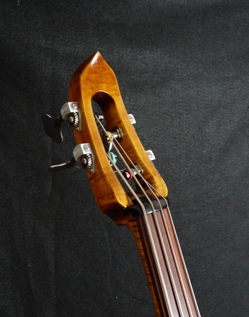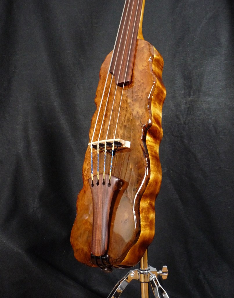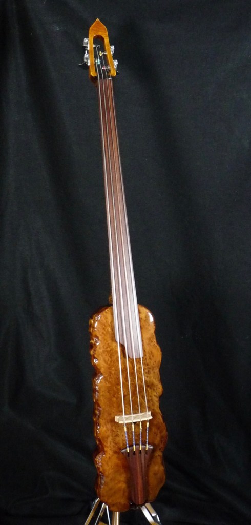 Electric upright bass, nicknamed “Woody” for the celebration of the woods used as well as a reference to the composer of ‘This Land Is Our Land’, Woody Guthrie. (Referring to the boat shaped headstock and the redwood used. “…From the redwood forests, to the Gulf Stream waters…”) A live edge redwood burl archtop on a hollow maple body with curly maple neck, Bolivian rosewood fingerboard and tailpiece, African Blackwood nut, Hipsot tuners, K&K Big Twin pickup on an adjustable maple bridge, D’Addario Helicore strings.