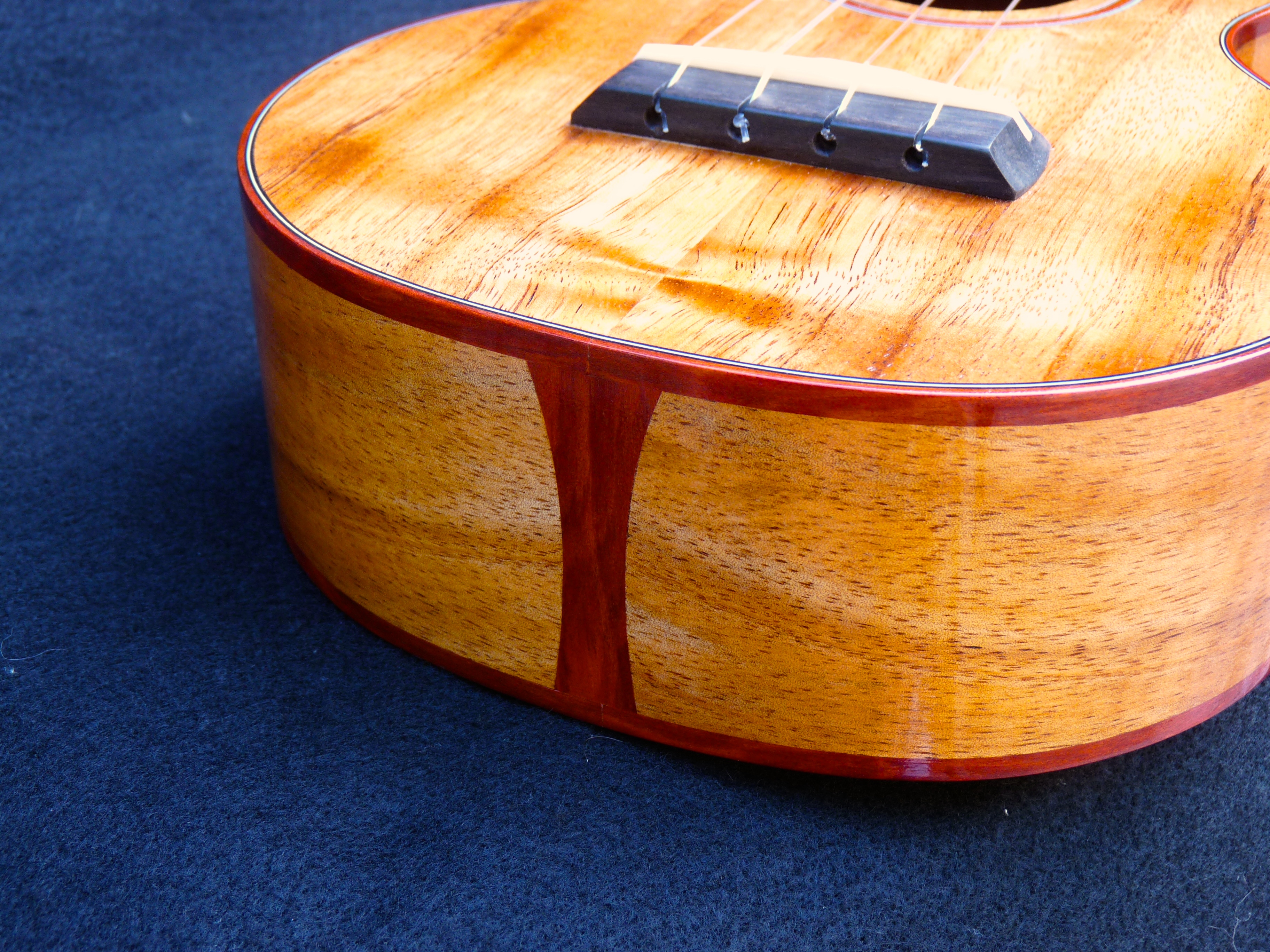 Kulakeiki, or “golden child”, concert ukulele made from solid koa, with bloodwood bindings and trim. Ebony fingerboard and bridge, mahogany/maple neck with carbon fiber reinforcing rods, bone nut and compensated saddle, and Gotoh deluxe friction tuners. Constructed almost entirely with hot hide glue and a traditional dovetail joint.