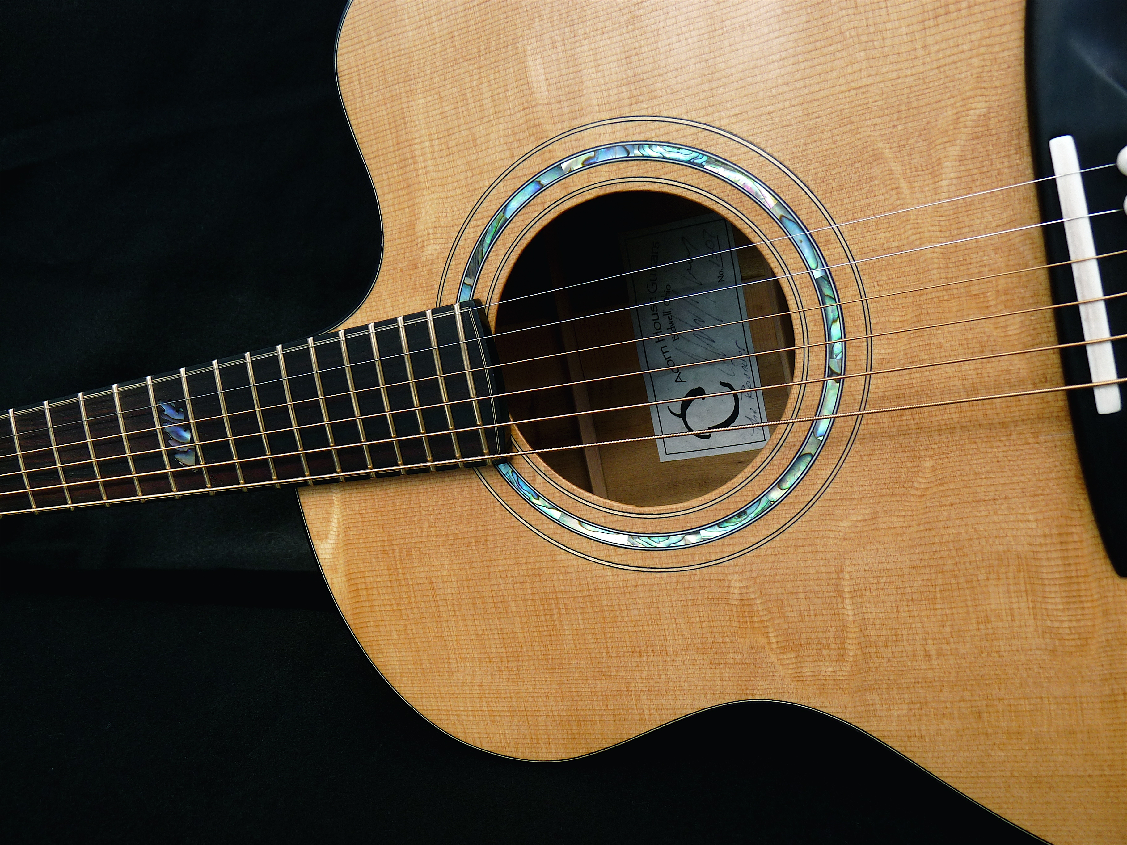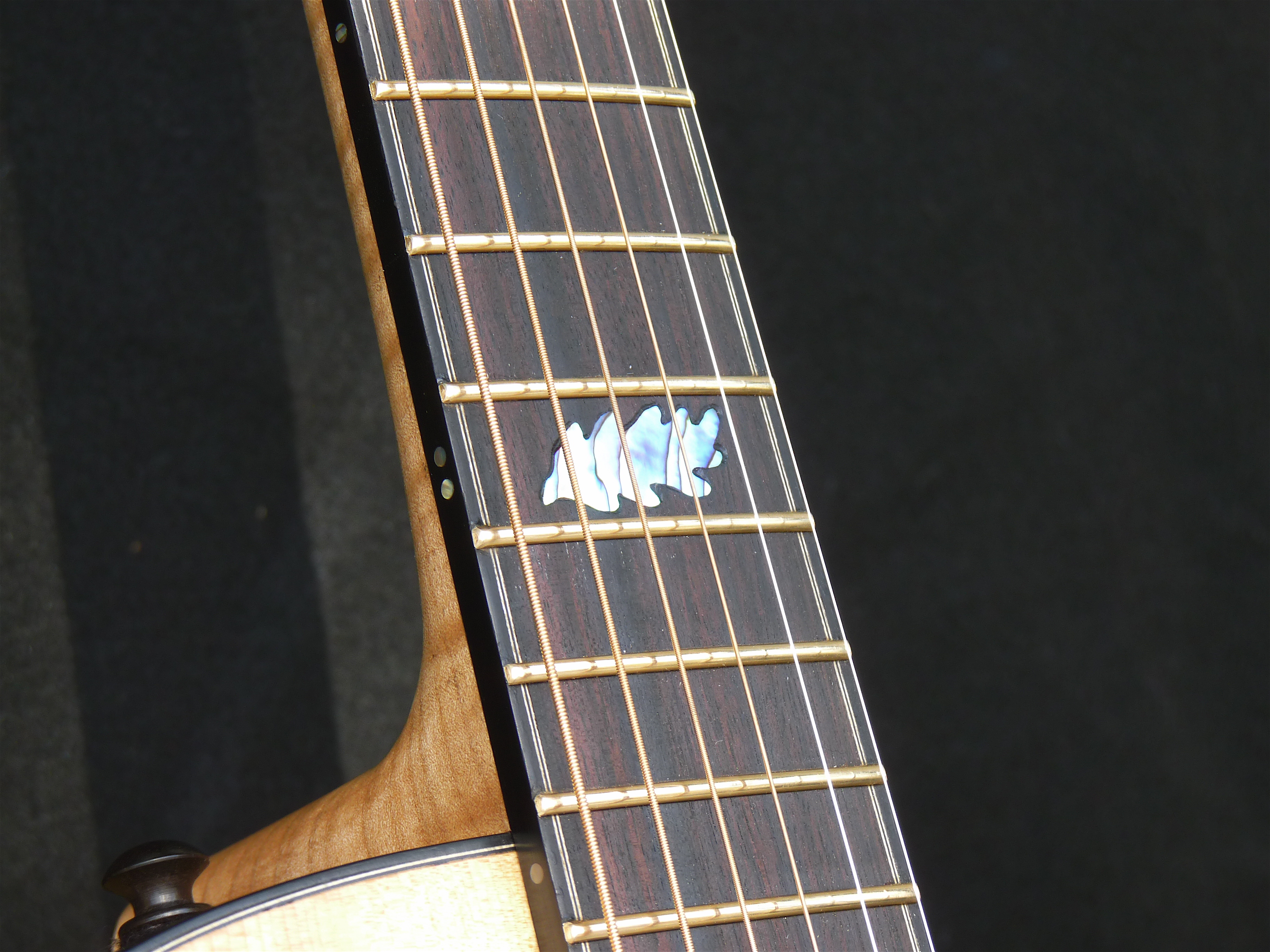 Pictured with a “Bearclaw” Sitka spruce top and Oregon myrtle back and sides with a curly maple neck with central walnut maple and mahogany layers. Macassar ebony fingerboard, ebony binding, bridge and headstock overlay with abalone rosette and acorn and leaf inlays. Gotoh tuners, gold “EVO” frets, and a JJB Artist series Prestige-330 pickup.